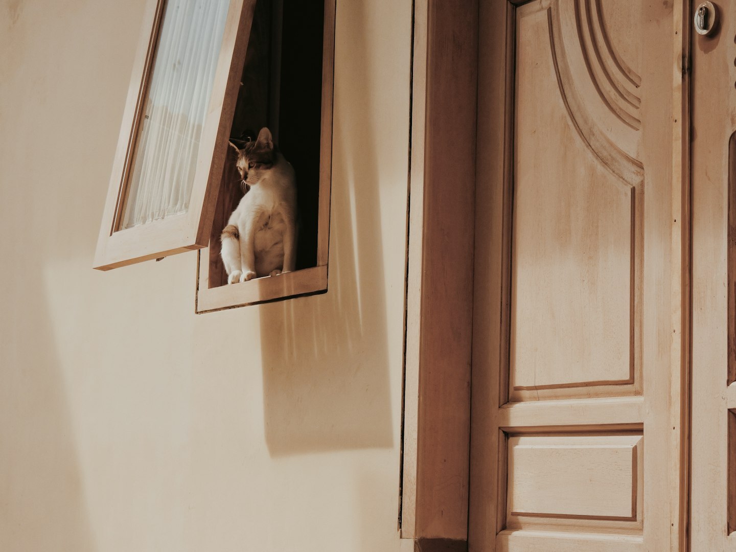 Unikalny domek dla kota wykonany ze sklejki, z wieloma poziomami i miejscem do zabawy.